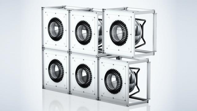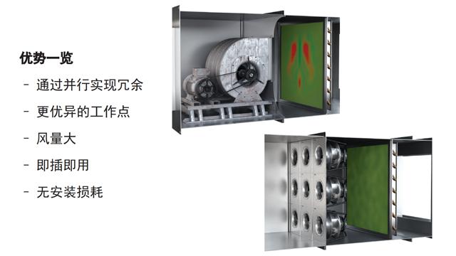 另一個優(yōu)點是氣流通過上風(fēng)口,尤其是下風(fēng)口的部件,例如過濾器和熱交換器時更加均勻。從而提高空氣過濾效率及傳熱性能。與單個大型離心風(fēng)機(jī)相比,多臺小風(fēng)機(jī)不僅重量輕而且安裝空間緊湊。這大大降低了系統(tǒng)成本并且易于更換風(fēng)機(jī)。